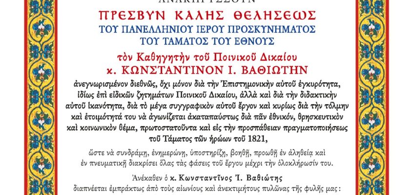 Μὲ μεγίστη ἠθικὴ ἱκανοποίησιν εἴχαμε τὴν τιμὴν νὰ βραβεύσουμε ὡς Πρέσβυν Καλῆς Θελήσεως ὑπὲρ τοῦ Τάματος τοῦ Ἔθνους τὸν Καθηγητὴν κ. Κωνσταντῖνον Ἰ. Βαθιώτην, ὄχι μόνον διὰ τὴν Ἐπιστημονικὴν αὐτοῦ ἐγκυρότητα, ἰδίως ἐπὶ εἰδικῶν ζητημάτων Ποινικού Δικαίου, ἀλλὰ καὶ διὰ τὴν διδακτικὴν αὐτοῦ ἱκανότητα, διὰ τὸ μέγα συγγραφικὸν αὐτοῦ ἔργον καὶ κυρίως διὰ τὴν τόλμην καὶ ἑτοιμότητά του νὰ ἀγωνίζεται ἀκαταπαύστως διὰ πᾶν ἐθνικόν, θρησκευτικὸν καὶ κοινωνικὸν θέμα, πρωτοστατοῦντα καὶ εἰς τὴν προσπάθειαν πραγματοποιήσεως τοῦ Τάματος τῶν ἡρώων τοῦ 1821.