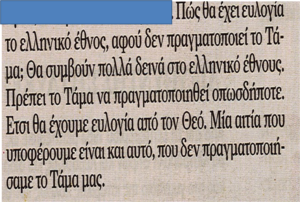 Το Τάμα του Έθνους είναι η συνέχεια του απελευθερωτικού αγώνα. Αυτό σημαίνει ότι πρέπει πάση θυσία να το υλοποιήσουμε. Κατά τον εορτασμό της 25ης Μαρτίου θα πρέπει να ανακοινωθεί η τοποθεσία. Αγνοείστε την κυβέρνηση είναι προσωρινή , είναι για τα σίδερα.