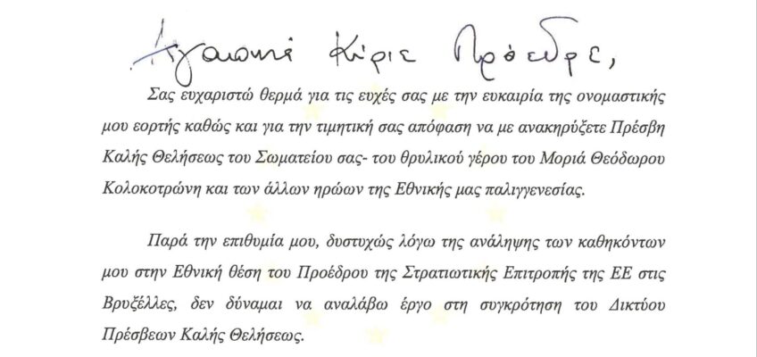 Εἰς αἰώνιον μνημόσυνον αὐτοῦ δημοσιεύομε τὴν ἀπὸ 23.11.2015 ἐπιστολή του (δημοσιευθεῖσα εἰς τὸ Περιοδικόν μας ΦΩΤΕΙΝΗ ΓΡΑΜΜΗ τεῦχος 65 σελ. 95), ὅπου μᾶς τιμᾶ ἡ ἐκτίμησις του πρὸς τοὺς φορεῖς μας καὶ τὶς δραστηριότητές μας, ἀλλὰ καὶ ἡ πολὺ μεγάλη οἰκειότητα μεταξύ μας.