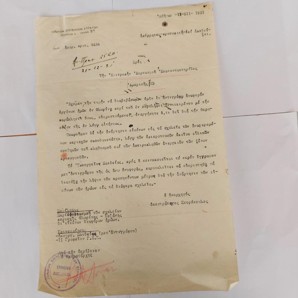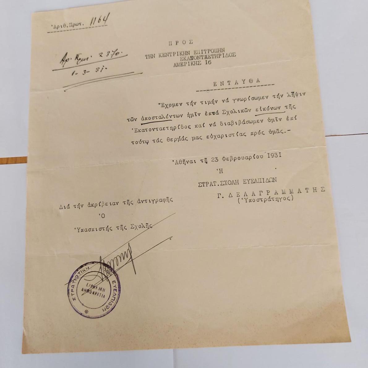 Παραδειγματιζόμαστε ἀπὸ τοὺς νεώτερους προγόνους μας, οἱ ὁποῖοι μὲ ἀπερίγραπτο – ἀπίστευτο ζῆλον, ἐπ’ εὐκαιρίᾳ τῆς κοσμογονικῆς πανηγύρεως τῆς τοποθετήσεως τοῦ θεμελίου λίθου τοῦ μνημείου εὐγνωμοσύνης, εὐχαριστίας καὶ δοξολογίας εἰς τὸ ΠΕΔΙΟΝ ΤΟΥ ΑΡΕΩΣ τὴν 31.3.1930 καθιέρωσαν καὶ ἐπραγματοποίησαν μὲ θρησκευτικὴ εὐλάβεια (μεταξὺ τῶν πολλῶν ἄλλων ἀγαθῶν ἐνεργειῶν των) καὶ τὴν ἀποστολὴ χαρτῶν /εἰκόνων μὲ τοὺς ἥρωες τοῦ 21 σὲ ὅλα τὰ Σχολεῖα τῆς Ἑλλάδος (ἴδ. Ἔγγραφον Κεντρικῆς Ἐπιτροπῆς Ἑκατονταετηρίδος – φωτογραφία 7), εἰς τὰ Στρατόπεδα τῆς Χώρας (ἴδ. Ἔγγραφον Γενικοῦ Ἐπιτελείου Στρατοῦ ὑπ’ἀρ.πρωτοκ. 4434/ 11.12.1931 – φωτογραφία 8), εἰς τὴν Σχολὴ Εὐελπίδων (ἴδ.Εὐχαριστήριον Ἔγγραφον τῆς Σχολῆς Εὐελπίδων ὑπ’ἀριθμ. πρωτοκ.1164/23.2.1931 φωτογραφία 9) κλπ….