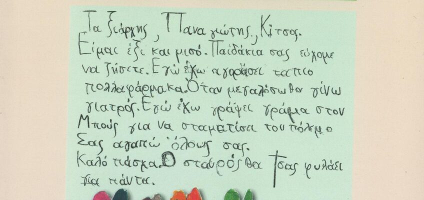Ἐπειδὴ στοὺς πολέμους θύματα εἶναι τὰ παιδιά, ἄς ἀκούσουμε σήμερα τὴν φωνὴ ἑνὸς ἑλληνόπαιδος τὰ χρόνια τοῦ πολέμου τῆς διαλύσεως τῆς Γιουγκοσλαβίας μέσα ἀπὸ ἕνα σημειωματάκι του ποὺ εὑρήκαμε συσκευάζοντες τὶς ἀνθρωπιστικὲς βοήθειες ποὺ μᾶς ἔστελναν ἀπὸ ὅλη τὴν Ἑλλάδα καὶ ὀργανώναμε 10 – 20 – 30 νταλίκες ἡμερησίως καὶ τὶς ἀποστέλναμε καὶ τὶς διανέμαμε μέχρι καὶ τὸ τελευταῖο χωριὸ τῆς πρώην Γιουγκοσλαβίας.