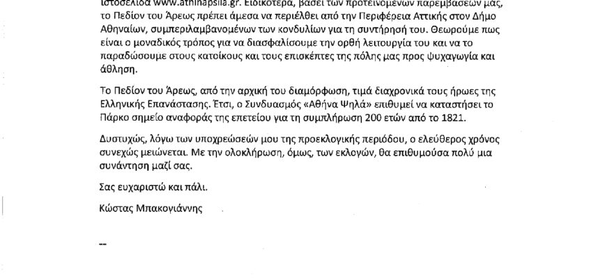Κοινοποιοῦμε ἀντίγραφον τῆς ἀπὸ 17.5.2019 ἐπιστολῆς τοῦ κ. Κων/νου Μπακογιάννη, ὡς τότε Δημάρχου Ἀθηναίων, πρὸς ἡμᾶς, ὅπου ὁ κ. Μπακογιάννης  ἐπικροτοῦσε καὶ ὑπερθεμάτιζε  νὰ πραγματοποιηθῇ τὸ Τάμα τοῦ Ἔθνους εἰς τὸ Πεδίον τοῦ Ἄρεως, ἐκεῖ ὅπου ἐτέθη ὁ Θεμέλιος Λίθος τὴν 30.3.1930   ὑπὸ τῶν τότε Νομίμων Ἀνωτάτων Ἀρχόντων: