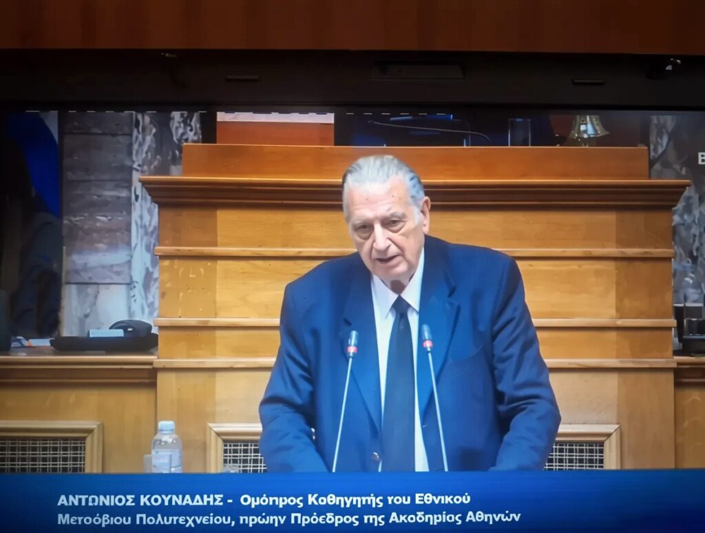 Εἶναι γνωστή, σταθερή καὶ παγία ἡ ἐρευνητικὴ δραστηριότης τοῦ πρώην Προέδρου τῆς Ἀκαδημίας Ἀθηνῶν, ὁμοτίμου Καθηγητοῦ τοῦ Ε.Μ.Π. Ἐξοχωτάτου κ. Ἀντωνίου Κουνάδη περὶ τὴν Ἑλληνικὴ Γλῶσσα.