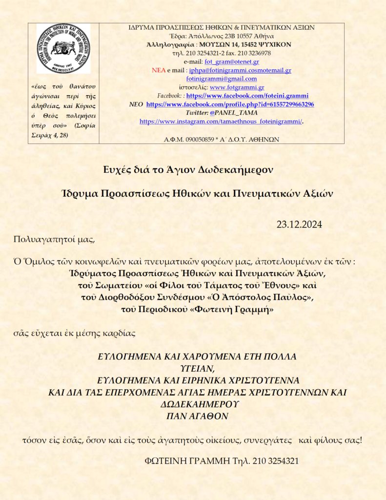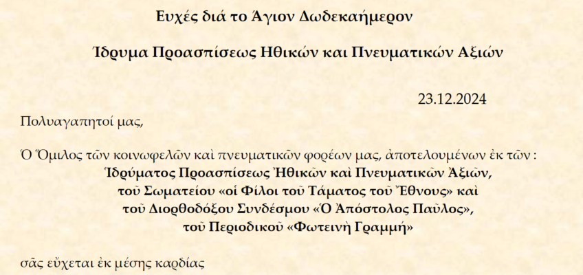 23 Δεκ 2024 Ευχές διά το Άγιον Δωδεκαήμερον Ίδρυμα Προασπίσεως Ηθικών και Πνευματικών Αξιών 23.12.2024 από Foteini Grammi | αναρτήθηκε σε: Ευχές | 0 ΕΙΚΟΝΑ ΤΗΣ ΓΕΝΝΗΣΕΩΣ ΤΟΥ ΧΡΙΣΤΟΥ Ι.Ν ΑΓΙΟΥ ΝΕΟΥ ΟΣΙΟΜΑΡΤΥΡΟΣ ΠΑΥΛΟΥ ΑΡΟΑΝΙΑΣ ΣΤΗΝ ΑΡΟΑΝΙΑ ΚΑΛΑΒΡΥΤΩΝ ΕΡΓΟ ΤΟΥ ΙΠΗΠΑ