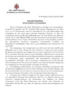 3) Ἐπιπροσθέτως ἡ Ἱερατικὴ Σύναξις τῆς Ἱ. Μητροπόλεως Κυθήρων καὶ Ἀντικυθήρων μὲ τὸ ἀπὸ 23.4.2021 ἀνακοινωθὲν προτείνει (λογικά) ἡ Λειτουργία τῆς Ἀναστάσεως τὸ 2021 νὰ γίνῃ τὴν πρωία τῆς Κυριακῆς 2.5.2021 (https://docs.google.com/viewerng/viewer?url=http://www.imkythiron.gr/images/stories/pdf/anakoinwthen_ ΣΥΝΗΜΜΕΝΟΝ 3)
