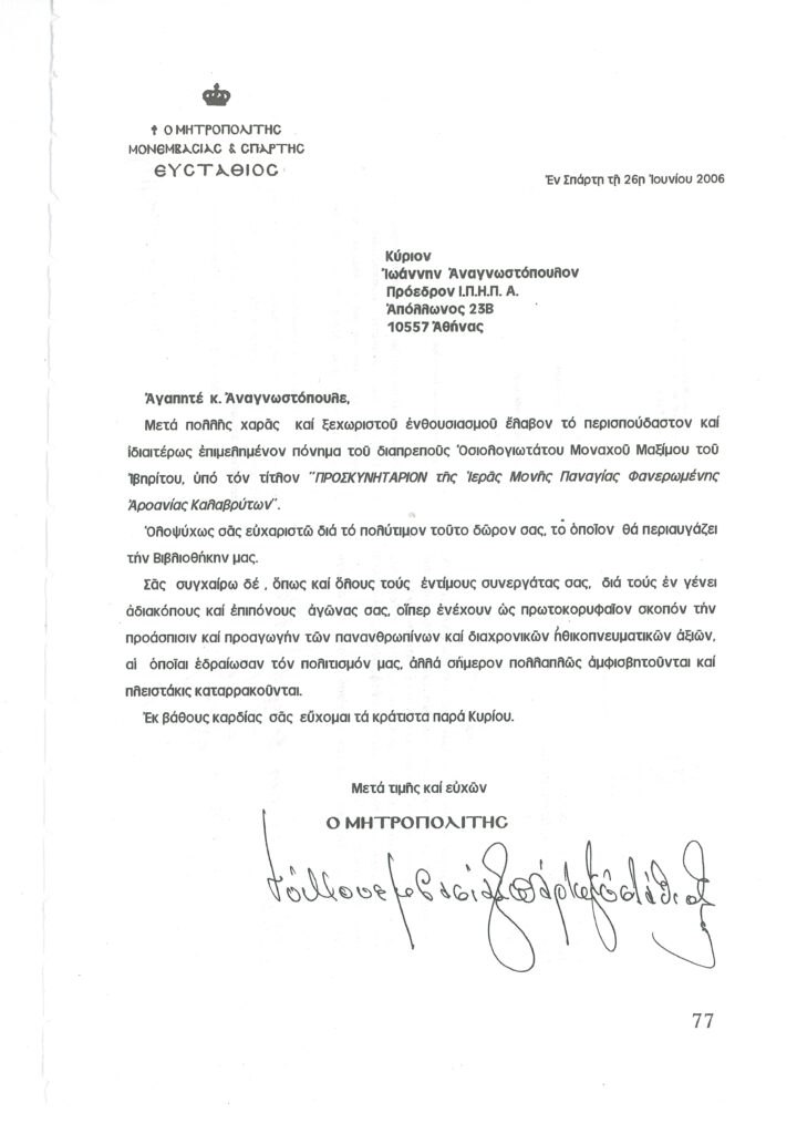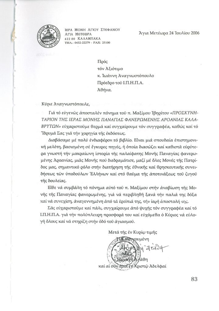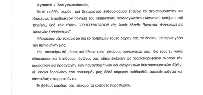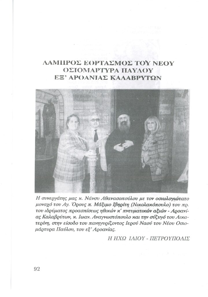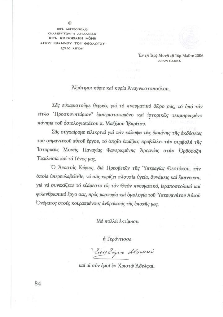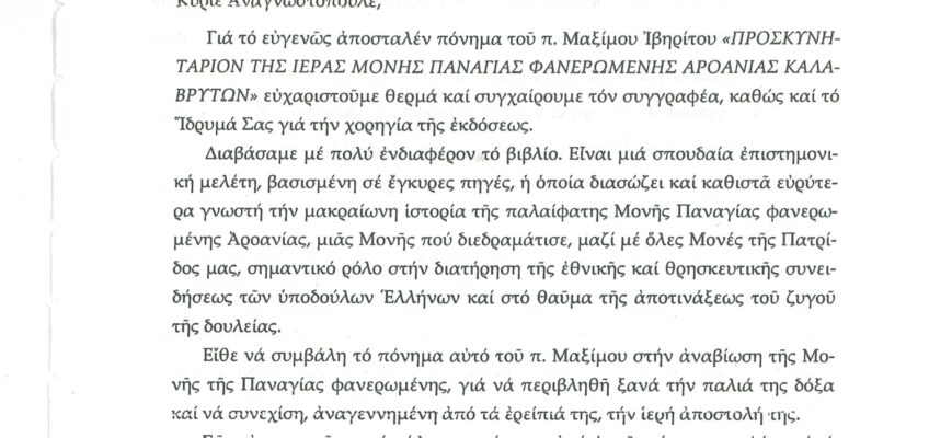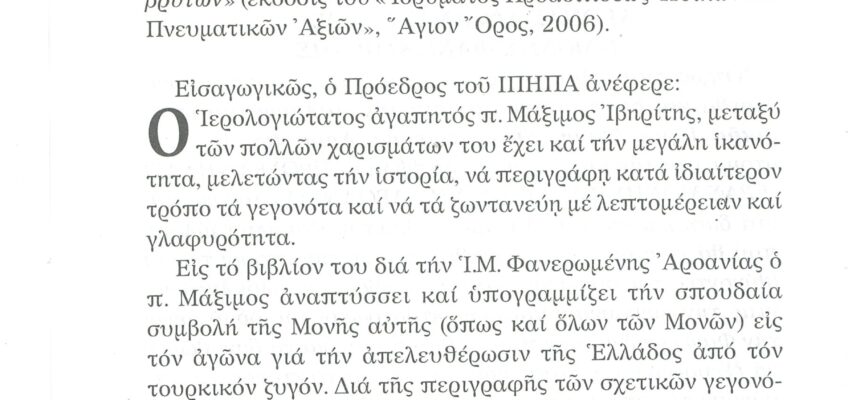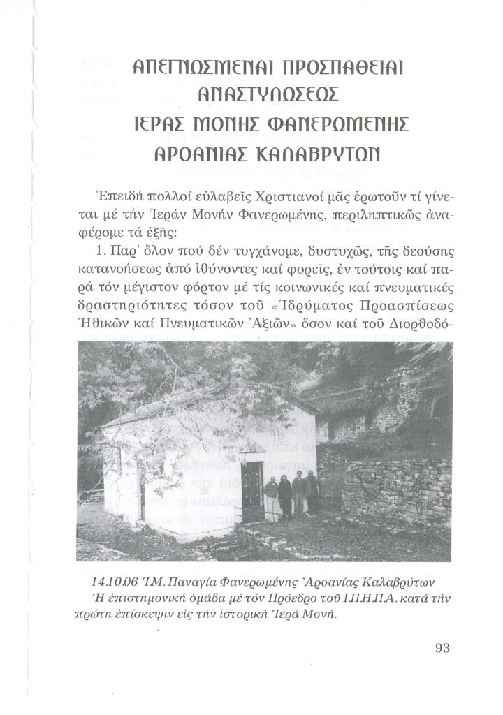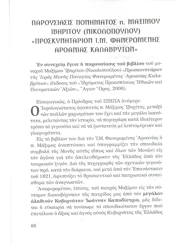 ΦΩΤΕΙΝΗ ΓΡΑΜΜΗ 29 -ΠΑΡΟΥΣΙΑΣΗ ΠΟΝΗΜΑΤΟΣ π. ΜΑΞΙΜΟΥ ΙΒΗΡΙΤΟΥ “ΠΡΟΣΚΥΝΗΤΑΡΙΟΝ Ι.Μ. ΦΑΝΕΡΩΜΕΝΗΣ ΑΡΟΑΝΙΑΣ ΚΑΛΑΒΡΥΤΩΝ” -ΕΞΕΛΙΞΕΙΣ ΣΤΗΝ ΑΝΑΣΤΥΛΩΣΗ ΤΗΣ ΜΟΝΗΣ