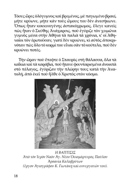 Σ’αὐτὰ τὰ μέρη κάνει πολὺ κρύο, καὶ τὶς πιὸ πολλὲς φορὲς οἱ ἀντένες τῶν καραβιῶν ἦταν χιονισμένες, ἕνα θέαμα πολὺ ἔμορφο. Ἀπάνου στὰ ξάρτια καὶ στὶς σκαλιέρες, στὶς γάμπιες καὶ στὰ μπαστούνια τῶν καραβιῶν ἦταν σκαλωμένοι πλῆθος θαλασσινοί, μεγάλοι καὶ μικροί. Ἡ θάλασσα ἦταν κοιμισμένη, μπουνάτσα. Κρούσταλλα κρεμόνταν ἀπὸ τὰ ξάρτια σὲ πολλὰ καΐκια. Κρύο τάρταρος. Στὴν κάθε βάρκα, ἀπὸ ἐκεῖνες ποὺ εἶχαν κοντοζυγώσει στὴ στεριὰ καὶ περίμεναν νὰ πέσῃ ὁ Σταυρὸς στὴ θάλασσαν, ἐστέκονταν ἀπὸ ἕνα – δυὸ νοματέοι ἐπάνω στὴ πλώρη, ἐνῷ ἄλλοι δυὸ ἦταν στὰ κουπιά. Αὐτοὶ ποὺ ἐστέκονταν ὀρθοὶ στὴν πλώρη, ἦταν ὁλόγυμνοι, ἐξὸν ἕνα ἄσπρο βρακὶ ποὺ ἐφοροῦσαν σὰν πεστιμάλι. Οἱ πιὸ πολλοὶ ἦταν σὰν θεριά, χεροδύναμοι, πλαταράδες, χοντρολαίμηδες, μαλλιαρόστηθοι, τὰ κορμιὰ των ἦταν κόκκινα ἀπὸ τὸ κρύο. Τὰ ποδάρια τους ἦταν γερὰ καὶ φουσκωμένα σὰν ἀδράχτια, θαλασσάνθρωποι, γεμιτζῆδες, κοντραμπατζῆδες, ψημένοι μὲ τ’ ἁλάτι. Οἱ πιὸ πολλοὶ εἶχαν ριχμένες στὶς πλάτες τὶς γοῦνες τους, γιὰ νὰ μὴν παγώσουν. Ἕνα – δύο ὅμως ἐστέκονταν γυμνοὶ καὶ ἐκάναν κάπου – κάπου τὸν σταυρό τους. Μὰ τὸ μάτι τους ἦταν καρφωμένο στὸ μέρος ποὺ θὰ ‘ριχνε τὸν Σταυρὸ ὁ δεσπότης.