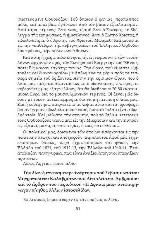 15. Ὄχι μόνον ἀμύθητα ποσὰ ἔχουν διαθέσει, διαχειρισθῆ, σφετερισθῆ καὶ νοσφισθῆ τὰ «τρωκτικὰ» τῆς πολιτικῆς, πνευματικῆς καὶ θρησκευτικῆς ἡγεσίας εἰς περιόδους ἀνθίσεως τῆς οἰκονομίας, ἀλλὰ ἀκόμη καὶ εἰς τὴν ἐποχὴν τῆς παντοειδοῦς κρίσεως, ποὺ διερχόμεθα καὶ μᾶς κατήντησαν εἰς τὸ χεῖλος τῆς ἀβύσσου, ἀμέσως ἤ ἐμμέσως δὲ κόπτονται ἰθύνοντες τῆς πνευματικῆς καὶ πολιτικῆς ἡγεσίας, εὐλογούσης ἤ «ποιουμένης τὴν νῆσσαν» τῆς θρησκευτικῆς ἡγεσίας, διὰ πραγματοποίησιν τεμένους εἰς τὰς Ἀθήνας καὶ τζαμιῶν εἰς ὅλην τὴν Ἑλλάδα…