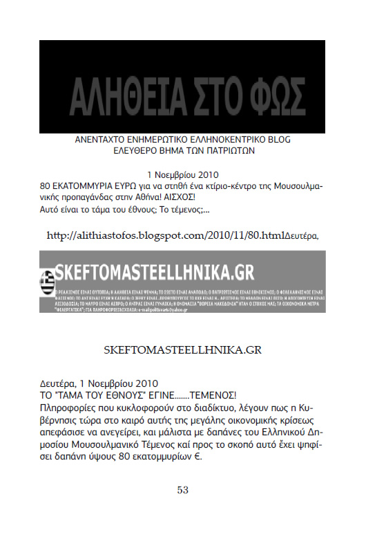 Ὅταν ὁ κ. Προβόπουλος προτείνει νὰ κλείσουν τὰ ΚΑΠΗ διὰ νὰ σωθῇ ἡ οἰκονομία, εἶναι τραγικὸν ἡ Κυβέρνησις νὰ διαθέτῃ 80 ΕΚΑΤΟΜΜΥΡΙΑ ΕΥΡΩ δια νὰ στηθῇ ἕν κτίριον-κέντρον τῆς Μουσουλμανικῆς προοαγάνδας εἰς τὴν Ἀθήνα! ΑΙΣΧΟΣ! Ὅταν ἡ Ὑπουργὸς Παιδείας κα Διαμαντοπούλου ἐπιχειρεῖ νὰ καταργήσῃ τὸ μάθημα τῶν Θρησκευτικῶν ἀπὸ τὰ Δημόσια Σχολεῖα, ἡ δὲ Κυβέρνησις διαθέτει ΟΓΔΟΝΤΑ ΕΚΑΤΟΜΜΥΡΙΑ ΕΥΡΩ δια νὰ στήσῃ ἕν Κέντρον Μουσουλμανικῆς Προπαγάνδας εἰς τὴν Ἀθήνα! Μήπως ἔχουμε Κυβέρνησιν – Παράρτημα τῆς Τουρκικῆς εἰς τὴν Χώραν μας; ΑΙΣΧΟΣ!