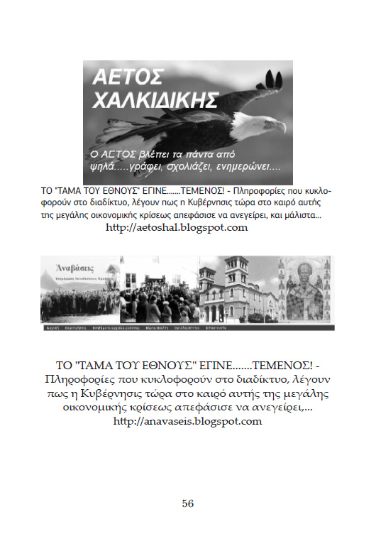 11. Ὅλα αὐτὰ τὰ ἰταμὰ καὶ ἰδιοτελέστατα «ἀνθρωπάκια» εἴτε ἦσαν «ἐθνοπατέρες» εἴτε ἦσαν συρφετὸς τῶν «κλαδικῶν» καὶ τῶν «ἡμετέρων», ἐφήρμοζον τὸ αἴτημά των: «Τσοβόλα δόστα ὅλα» καὶ ἰδοὺ τὸ κατάντημά μας. Ἔχουν κατακρημνισθῆ καὶ εὐτελισθῆ ὅλαι αἱ ἠθικαὶ καὶ πνευματικαὶ ἀξίαι καὶ αὐταὶ αἱ ἀπαξίαι-, ποὺ κατέστησαν βδέλλαι λαίμαργοι καὶ ἔχουν σπαταλήσει τὴν οὐσίαν τῶν μοχθούντων καὶ τῶν δεινοπαθούντων Ἑλλήνων, καὶ μᾶς ὡδήγησαν εἰς τὸ χεῖλος τῆς ἀβύσσου, αὐτοὶ οἱ ἐγκληματίαι πολιτικοὶ καὶ ὁ συρφετὸς αὐτῶν, συνδικαλισταὶ καὶ «ἡμέτεροι»…