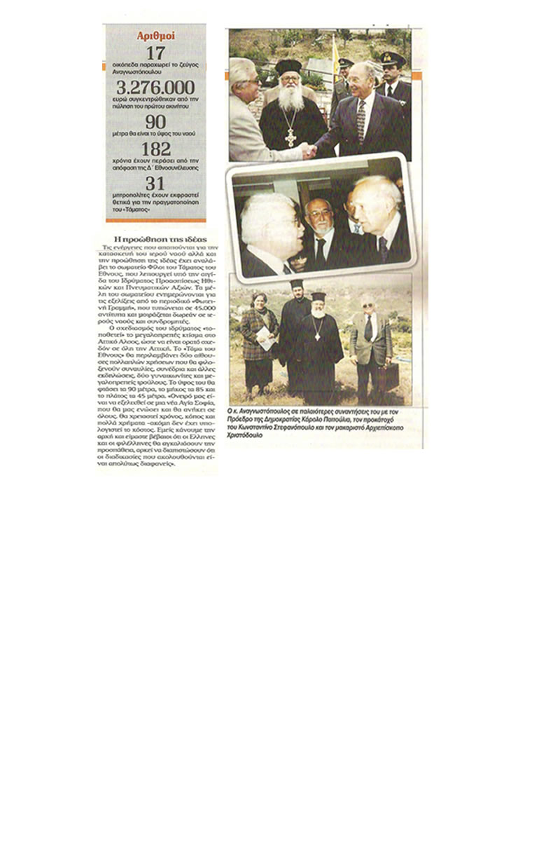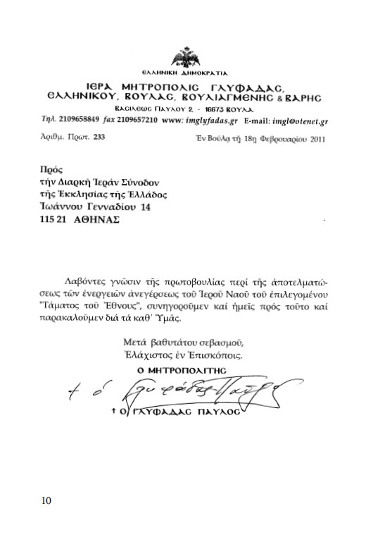 7. Δόξα τῷ Θεῷ ἐν τῷ μεταξὺ ἐτάχτηκαν ὑπὲρ τῆς πραγματοποιήσεως τοῦ μεγαλεπηβόλου καὶ κολοσσιαίου ἔργου τοῦ Τάματος τοῦ Ἔθνους καὶ οἱ Σεβασμιώτατοι Μητροπολῖται: Γλυφάδας κ. Παῦλος, Μονεμβασίας καὶ Σπάρτης κ. Εὐστάθιος, Μεσογαίας καὶ Λαυρεωτικῆς κ. Νικόλαος, Λαρίσσης κ. Ἰγνάτιος, Καρπενησίου κ. Νικόλαος, Ἐδέσσης, Πέλλης καὶ Ἀλμωπίας κ. Ἰωήλ, Δράμας κ. Παῦλος, Κίτρους, Κατερίνης καὶ Πλαταμῶνος κ. Ἀγαθόνικος, Νέας Κρήνης καὶ Καλαμαριᾶς κ. Προκόπιος, Γόρτυνος καὶ Μεγαλοπόλεως κ. Ἱερεμίας