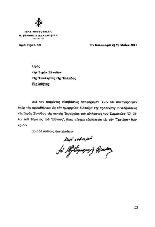 6. Μετὰ ἀπὸ τὴν δημοσίευσιν σχετικῆς ἐπιστολῆς τοῦ ταπεινοῦ καὶ εὐλαβοῦς Σεβασμιωτάτου Μητροπολίτου Αἰτωλίας καὶ Ἀκαρνανίας εἰς τὸν «ΟΡΘΟΔΟΞΟΝ ΤΥΠΟΝ» καὶ τὴν δημοσίευσιν εἰς τὴν ἱστοσελίδα μας www.fotgrammi.gr καὶ εἰς τὸ περιοδικόν μας «Φωτεινή Γραμμή» τεῦχος 46, σελ. 27-40 σχετικῶν ἐπιστολῶν τῶν ἐννέα (9) πρώτων Μητροπολιτῶν (Καλαβρύτων καὶ Αἰγιαλείας, Ἠλείας, Μαρωνείας καὶ Κομοτηνῆς, Δρυϊνουπόλεως Πωγωνιανῆς καὶ Κονίτσης, Κυθήρων καὶ Ἀντικυθήρων, Σταγῶν καὶ Μετεώρων, Αἰτωλίας καὶ Ἀκαρνανίας, Θεσσαλιώτιδος καὶ Φαναριοφαρσάλων, Μυτιλήνης) πρὸς τὴν Ἱερὰν Σύνοδον, εἴχαμε καὶ τὴν συνηγορίαν καὶ ἀπὸ πληθώραν ἄλλων ἁγνῶν ἰδεολόγων καὶ δεκάδων ἱστοσελίδων.