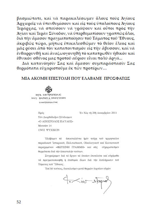 Ἠναγκάσθημεν νὰ περικόψωμεν πολλὰς παραγράφους ἀπὸ τὰ ἀνωτέρω ἔγγραφά μας, διότι ἔχουν διὰ πολλοστὴν φοράν, εἰς τὸ ἀπὸ 9.1.2012 ὑπόμνημά μας καὶ παλαιότερον ἀναφερθῆ καὶ ὑπερτονισθῆ, πρὸς ἐμπέδωσιν τῆς ἀναγκαιότητος τῆς πραγματώσεως τοῦ Τάματος τοῦ Ἔθνους εἰς τὴν συνείδησιν καὶ ἐκείνων τῶν λαϊκῶν καὶ κληρικῶν, οἱ ὁποῖοι εἶναι μὲν ἀγαθοπροαίρετοι, πλὴν ὅμως διστακτικοί, ὀλιγόπιστοι καὶ ἄτολμοι καὶ ἐπηρεάζονται εὐκόλως ἀπὸ τὴν ἐπικρατοῦσαν ἀθυμίαν καὶ λίαν ἀνησυχαστικὴν κατάστασιν, ἤτοι ἀκαταστασίαν . . .