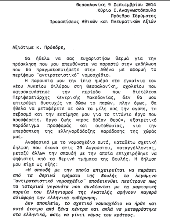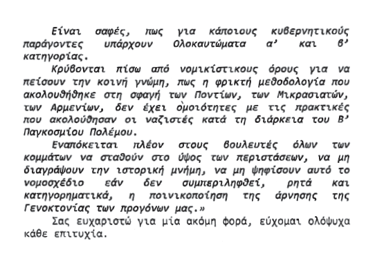 Τὸ ἄκρως ἀνησυχητικόν, ἀδιανόητον, ἀχαρακτήριστον καὶ ἀπαράδεκτον εἶναι νὰ παρασύρεται καὶ ἡ Διαρκὴς Ἱερὰ Σύνοδος τῆς Ἐκκλησίας τῆς Ἑλλάδος νὰ παρουσιάζῃ τὸν ἀντιχριστιανικὸν αὐτὸν νόμον (χωρὶς νὰ συμπεριληφθοῦν ρητῶς καὶ αἱ γενοκτονίαι τῶν Ποντίων, Μικρασιατῶν, Ἀρμενίων, τῶν Ρομά, τῶν Χριστιανῶν τῆς Ἀνατολῆς σήμερον, καὶ πληθώραν ἄλλων πραγματικῶν γενοκτονιῶν, ποὺ λαμβάνουν χώραν ἀπὸ καιροῦ εἰς καιρόν) ὡς ἀθώαν «περιστεράν»…