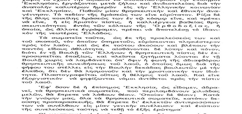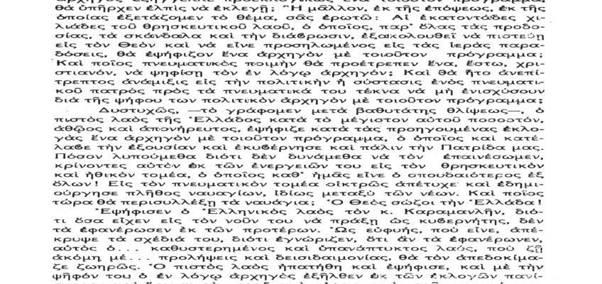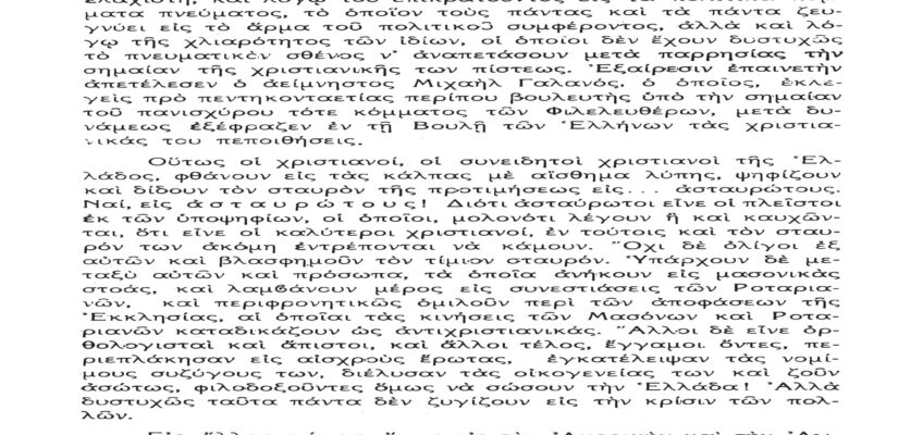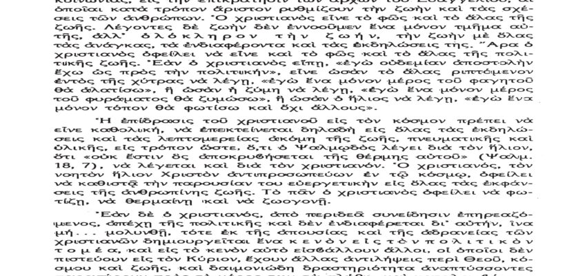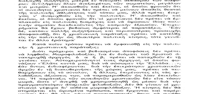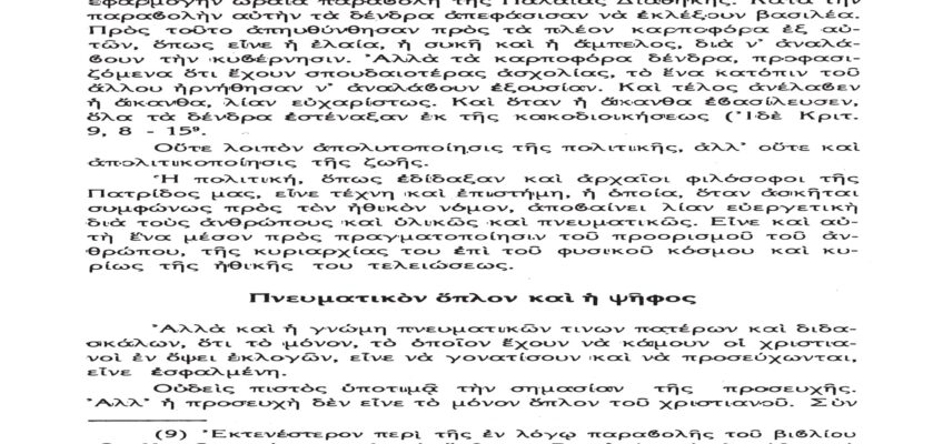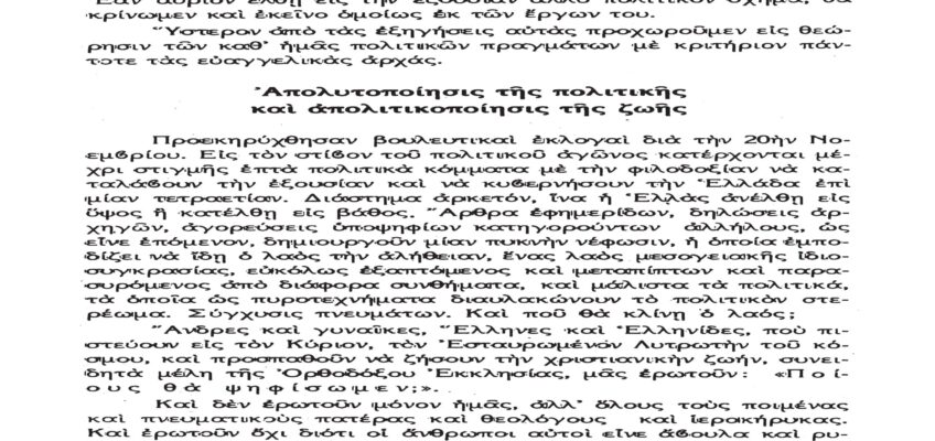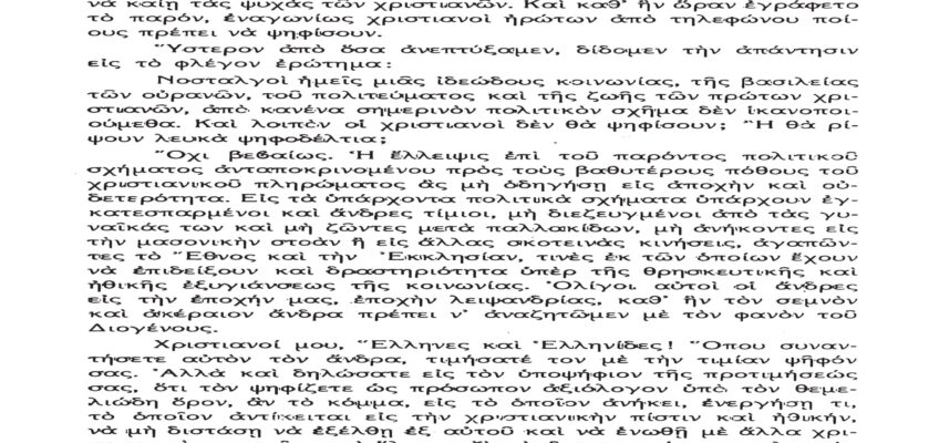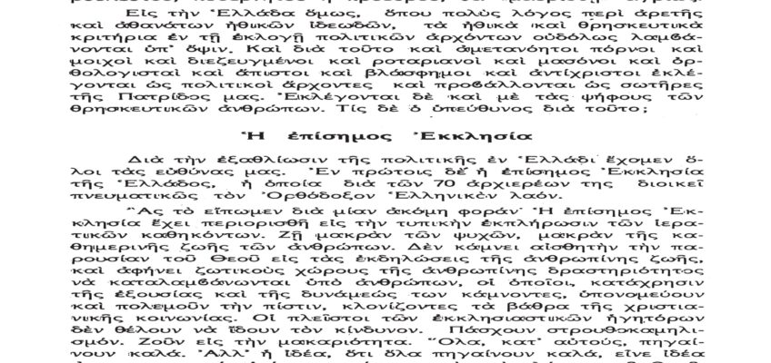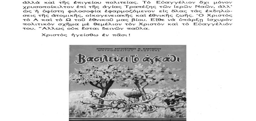 Τὸ παρὸν λίαν σπουδαῖον ἀπόσπασμα τὸ δημοσιεύομεν λόγῳ τοῦ λίαν ἐπικαίρου θέματος, καθὼς καὶ διὰ τὴν ἐπανάληψιν τῶν ἰδεωδῶν ὑψίστης ἀξίας τοῦ εἰς πάντα διαπρέψαντος Ἀειμνήστου Θρυλικοῦ Γέροντος πρώην Μητροπολίτου Φλωρίνης Αὐγουστίνου Καντιώτου, διὰ νὰ συγκρίνουν καὶ ἐνθυμοῦνται οἱ παλαιοὶ καὶ νὰ μαθαίνουν οἱ νέοι καὶ αἱ νέαι τῆς Ἑλλάδος!!!…