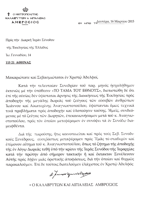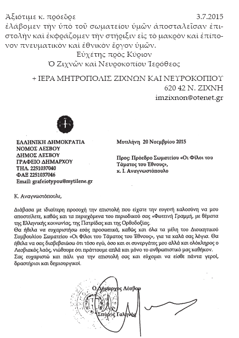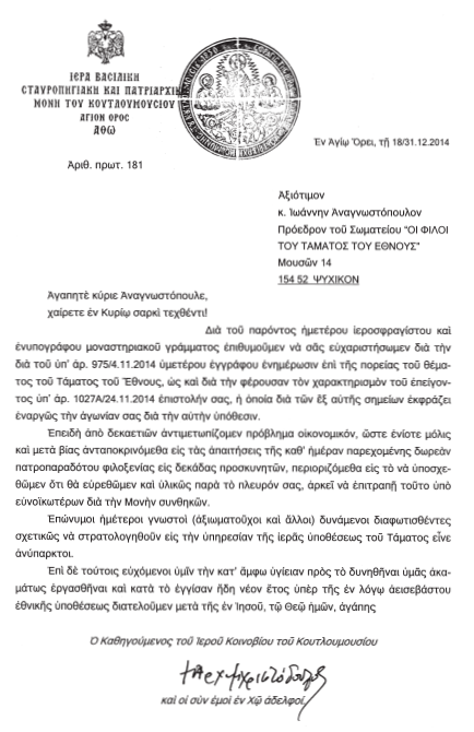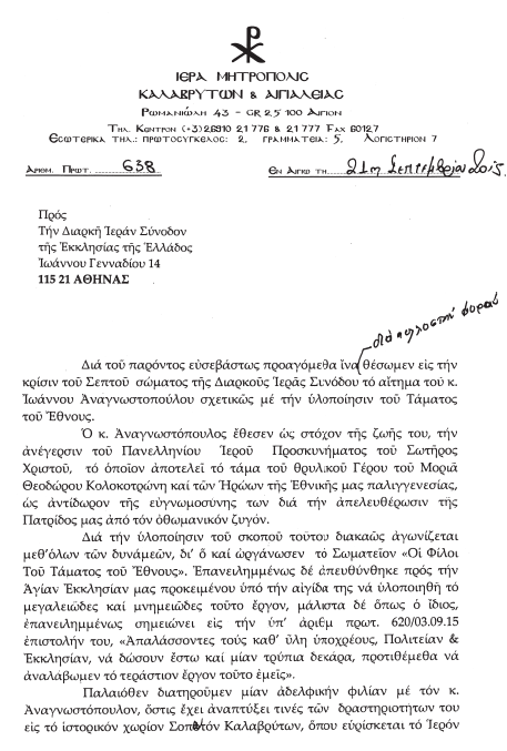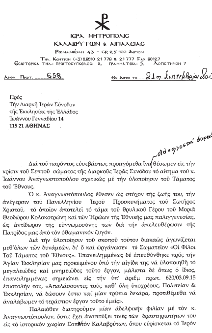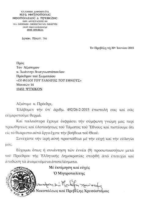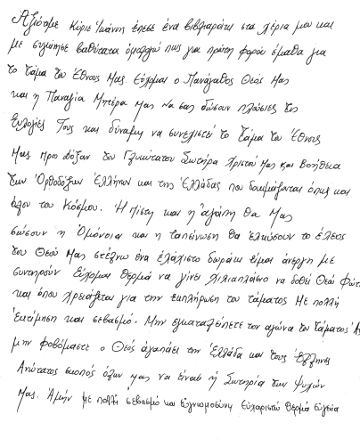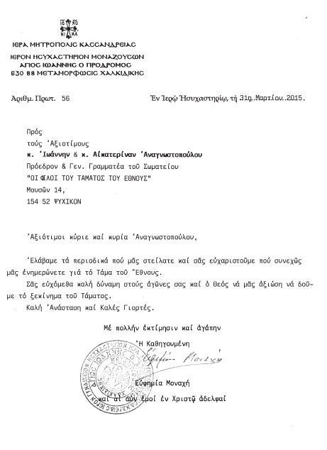 Κατωτέρω δημοσιεύομεν ἐπίσης τὴν ἐπιστολὴν μιᾶς εὐλαβοῦς καὶ ταπεινῆς ἄνεργης Χριστιανῆς, ἡ ὁποία διέθεσεν τὸ ὑστέρημά της καὶ μᾶς ἀπέστειλεν τό «ψωμί» της, δηλαδὴ 5 εὐρὼ διὰ τὸ Τάμα τοῦ Κολοκοτρώνη καὶ τῶν ἄλλων ἡρώων τῆς Ἐθνικῆς μας Παλιγγενεσίας.