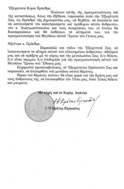 Τώρα ποὺ ἡ Ἑλλάδα εἶναι ἄρρωστη ἐγὼ δὲν θὰ τὴν παρατήσω ἀβοήθητη. Θὰ ἀφιερώσω τὸ ὑπόλοιπο μέρος τῆς ζωῆς μου στὸν Θεό μου καὶ στὴν Πατρίδα μου. Προσπαθῶ νὰ πουλήσω τὸ σπίτι μου καὶ ἔρχομαι.