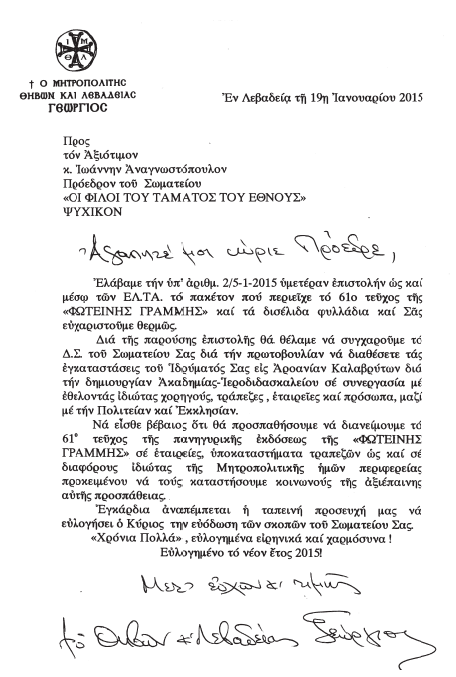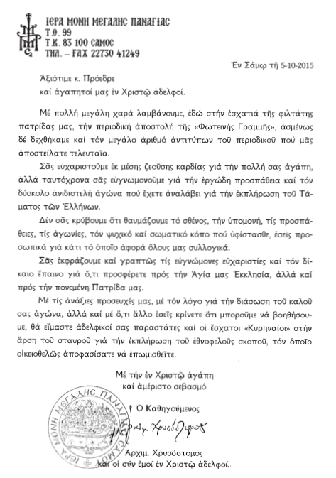 Ἐδιάβασα τὴν ΦΩΤΕΙΝΗ ΓΡΑΜΜΗ στὸ Μοναστῆρι Ἅγιος Ἀντώνιος ἐδῶ στὴν Ἀριζόνα καὶ συγκινήθηκα πάρα πολὺ ποὺ ἐπιτέλους ὑπάρχουν ἀκόμα Ὀρθόδοξοι Χριστιανοὶ στὴν Ἑλλάδα….Τὸ γεγονὸς ὅτι τὸ φυλλάδιο σας τὸ βρῆκα στὸ Μοναστῆρι Ἅγιος Ἀντώνιος καὶ τὸ πρότεινε ἕνας καλὸς καλόγηρος μοῦ ἄρκεσε καὶ ἀμέσως θέλησα γρήγορα νὰ ἐπικοινωνήσω καὶ νὰ σᾶς διαβεβαιώσω ὅτι δὲν εἶστε μόνοι, ὁ Θεὸς μας καὶ ἐγὼ καὶ ἑκατομμύρια ἀκόμη εἶναι μαζί σας.Αἰσθάνομαι πάρα πολὺ κοντὰ στὸν Θεό μας στὸ Μοναστῆρι καὶ δυστυχῶς ἡ κανονικὴ ἐκκλησία μας, ὅπως καὶ οἱ περισσότερες ἐκκλησίες καὶ οἱ λειτουργοί των, διαχειρίζονται σὰν business.