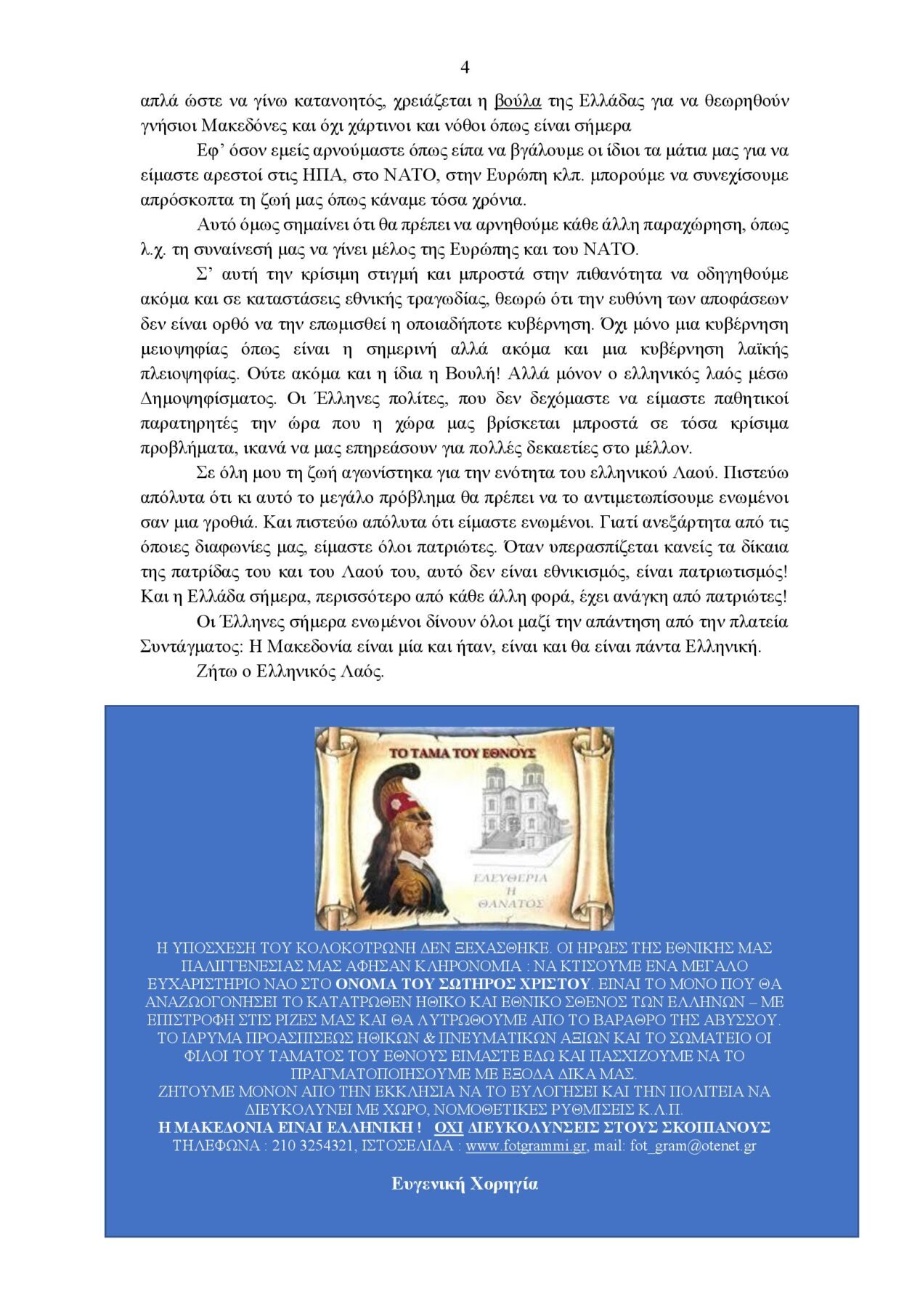 3. Αὐτὰ τὰ λίαν ἀποτρεπτικὰ συνθήματα καὶ ἄλλα πολλὰ τοῦ «ράδιο – ἀρβύλα», τὰ υἱοθέτησαν καὶ διπλοὶ πράκτορες τοῦ ἐχθροῦ τῶν ἁγνῶν ἰδανικῶν τῆς φυλῆς μας καὶ τὰ διέδιδαν παντοῦ καὶ ἐδημιούργησαν φοβίαν, διὰ νὰ μὴ προσέλθουν οἱ ἄνθρωποι εἰς τὴν Πλ. Συντάγματος. Ἀκόμη καὶ εἰς ἐμᾶς συνεβούλευον νὰ μὴ προσέλθωμεν. Διὰ νὰ μὴ ἀνέλθωμεν καὶ ἐμεῖς εἰς τὴν ἐξέδραν καὶ μιλήσωμεν δι’ ἕν λεπτὸν ὑπὲρ τοῦ Τάματος τοῦ Ἔθνους. Καὶ τοῦτο, διότι ὁ διπλὸς πράκτωρ δὲν ἔλαβεν τὰ 70.000 εὐρώ, τὰ ὁποῖα ἀπαιτοῦσεν ὡς συμμετοχήν μας εἰς τὸ συλλαλητήριον!!!…