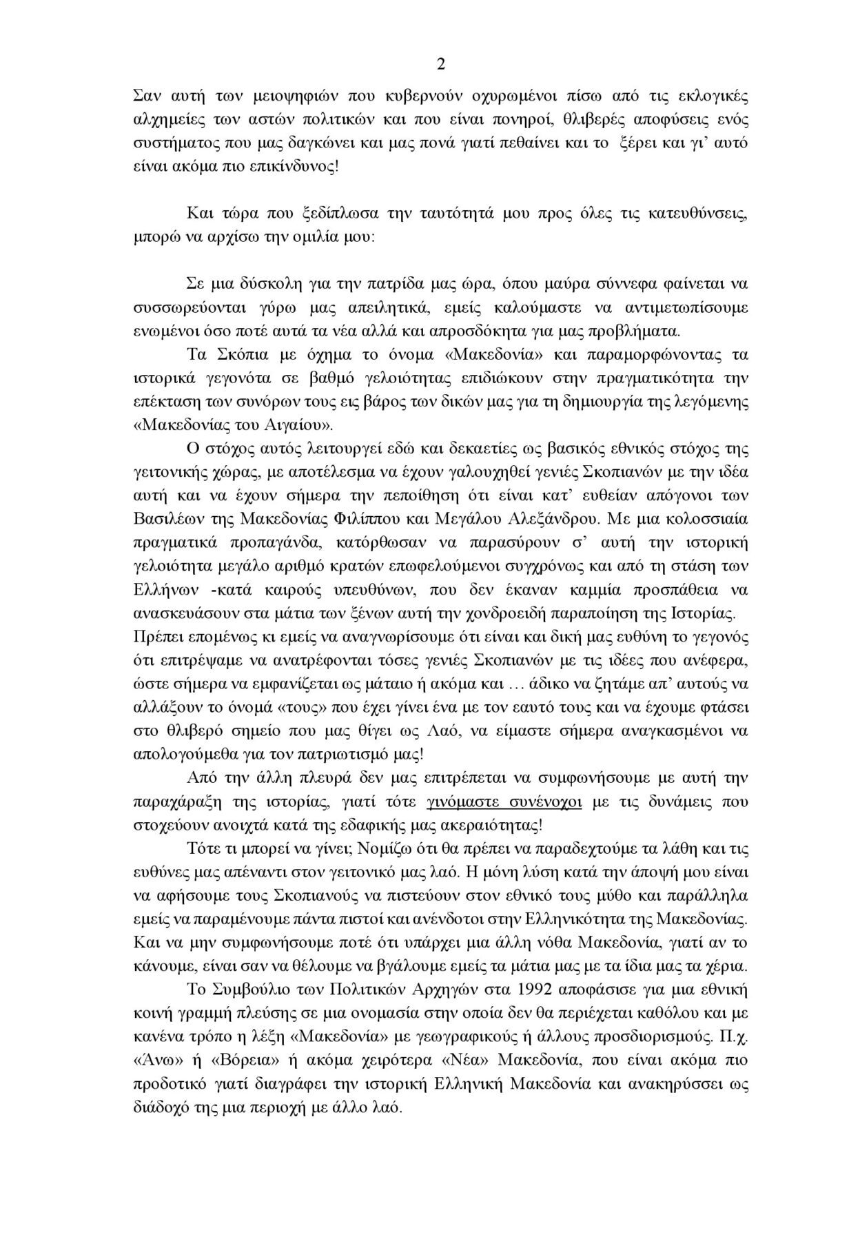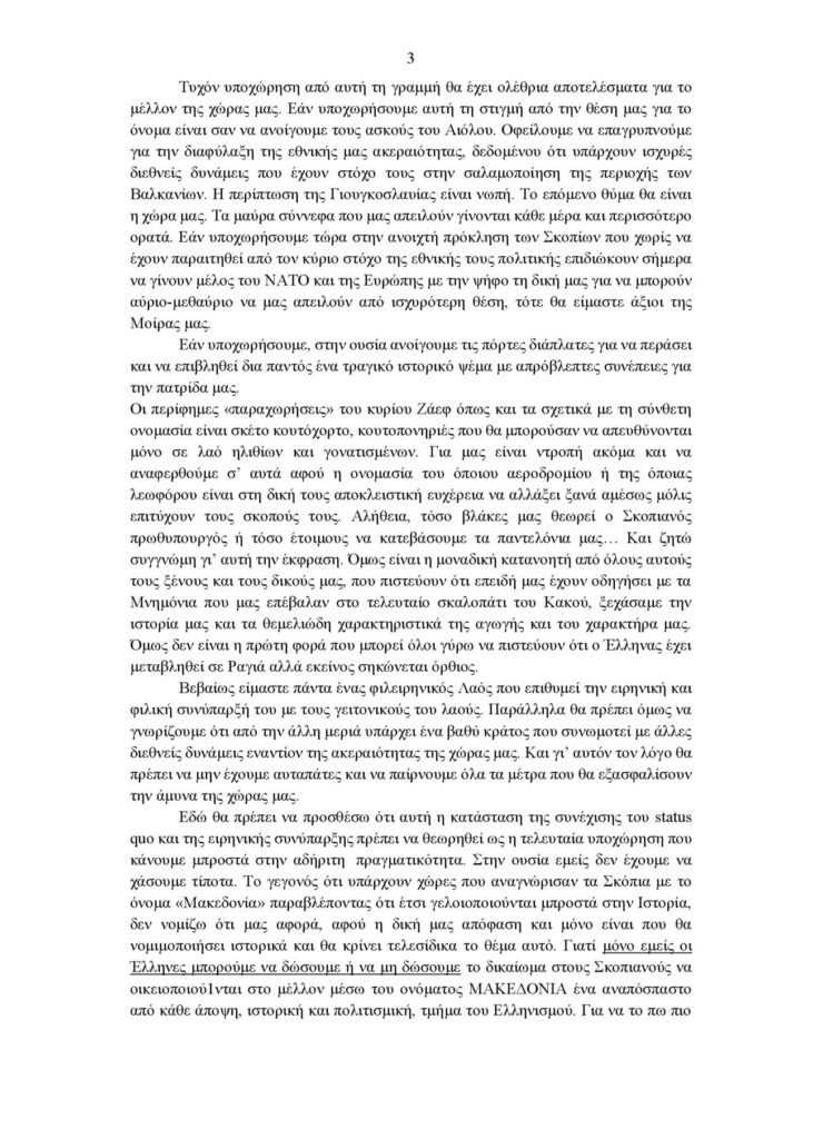 Ὁ κύριος Ὑπουργὸς τῶν Ἐξωτερικῶν προφανῶς ἔλαβεν ἐντολὴν ἀπὸ τά «ἀφεντικά»του, νὰ διορθώση καὶ τὴν μετριοπαθεστάτην ἐκτίμησιν τῆς Ἀστυνομίας, ἡ ὁποία ἔλαβεν ἐντολὴν ἀπὸ τὸν Ὑπουργόν τῶν Ἐξωτερικῶν νὰ περιωρίση τὸν ἀριθμὸν εἰς 140.000 καὶ ἐνεφανίσθη ὁ Ὑπουργὸς Ἐξωτερικῶν γενναιόδωρος καὶ ἀφήρεσεν ταχυδακτυλουργικῷ τῷ τρόπῳ 20.000 ἑλληνόψυχους… Μάλιστα δέ, διὰ νὰ ὑποστηρίξῃ τὰς ἀλχημείας του ἔστειλεν τὸ ἑλικόπτερον τῆς Ἀστυνομίας νὰ καταναλώνῃ καύσιμα καὶ νὰ ἐπιβαρύνῃ τὸν βαρύτατα φορολογούμενον πτωχὸν ἑλληνικὸν λαὸν νὰ λαμβάνῃ φωτογραφίας πολὺ ἐνωρὶς ἢ μετὰ τὸ συλλαλητήριον καὶ νὰ προβάλῃ ὀλίγα ἄτομα. Λογικώτατον εἶναι οἱ ἑλληνόψυχοι νὰ μὴ εἶχαν διανυκτερεύσει εἰς τὴν Πλατείαν Συντάγματος καὶ λοιπὰς πλατείας, καθ’ ὅτι εἶχεν φροντίσει ὁ ἴδιος ὁ Ὑπουργὸς τῆς Ἀστυνομίας νὰ δημιουργήση πανικόν, ὅτι θὰ ὑπάρχουν ἀντισυγκεντρώσεις τῶν γνωστῶν – ἀγνώστων, ὅτι θὰ ὑπάρχουν συμπλοκαὶ καὶ ὅτι θὰ χυθῇ αἷμα!!!…