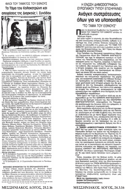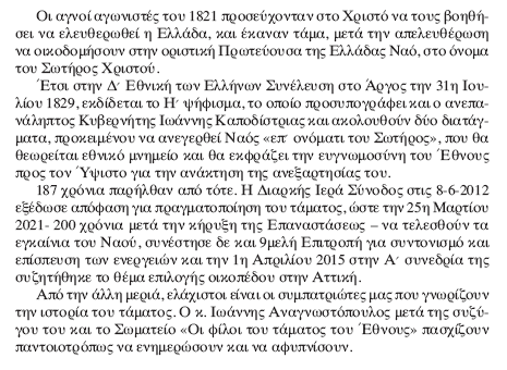 16. Ἄνω τοῦ ἡμίσεως τῶν Ἑλλήνων Μητροπολιτῶν, ὁ Ἀρχιεπίσκοπος Κρήτης, Μητροπολῖτες τοῦ Οἰκουμενικοῦ Πατριαρχείου, μέχρι καὶ ὁ Πατριάρχης Μόσχας ἔχουν ταχθῆ ὑπὲρ ἡμῶν γιὰ τὴν πραγματοποίησι τοῦ Τάματος τοῦ Ἔθνους.