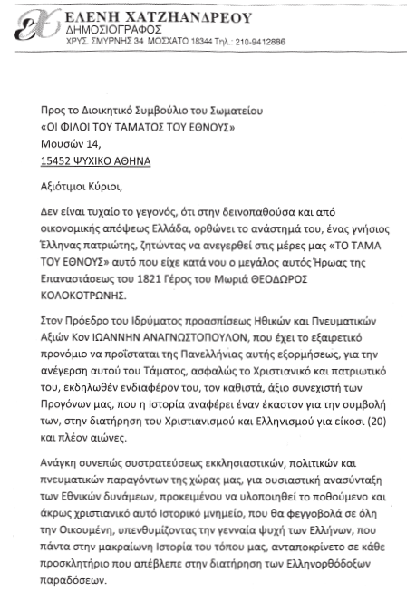 4. Τὸ Ἵδρυμα Προασπίσεως Ἠθικῶν καὶ Πνευματικῶν Ἀξιῶν, τὸ ὁποῖο συνέστησα προσφέροντας ὅλον τὸν μετὰ σωματικῶν καὶ ψυχικῶν ἀλγηδόνων ἀποκτηθέντα κόπον τοῦ βίου μου, μία οὐχὶ εὐκαταφρόνητη περιουσία (προϊόν μιᾶς σκληρῆς ἐργασίας 70 σχεδὸν ἐτῶν) μαζὶ μὲ τὸ Σωματεῖο οἱ Φίλοι τοῦ Τάματος τοῦ Ἔθνους, βλέποντας τὴν ἀβελτηρία τῶν καθ᾿ ὕλην ὑποχρέων, Πολιτείας καὶ Ἐκκλησίας, ἀπεφάσισαν νὰ πραγματοποιήσουν τὸ Πανελλήνιο Ἱερὸ Προσκύνημα τοῦ Τάματος τοῦ Ἔθνους.