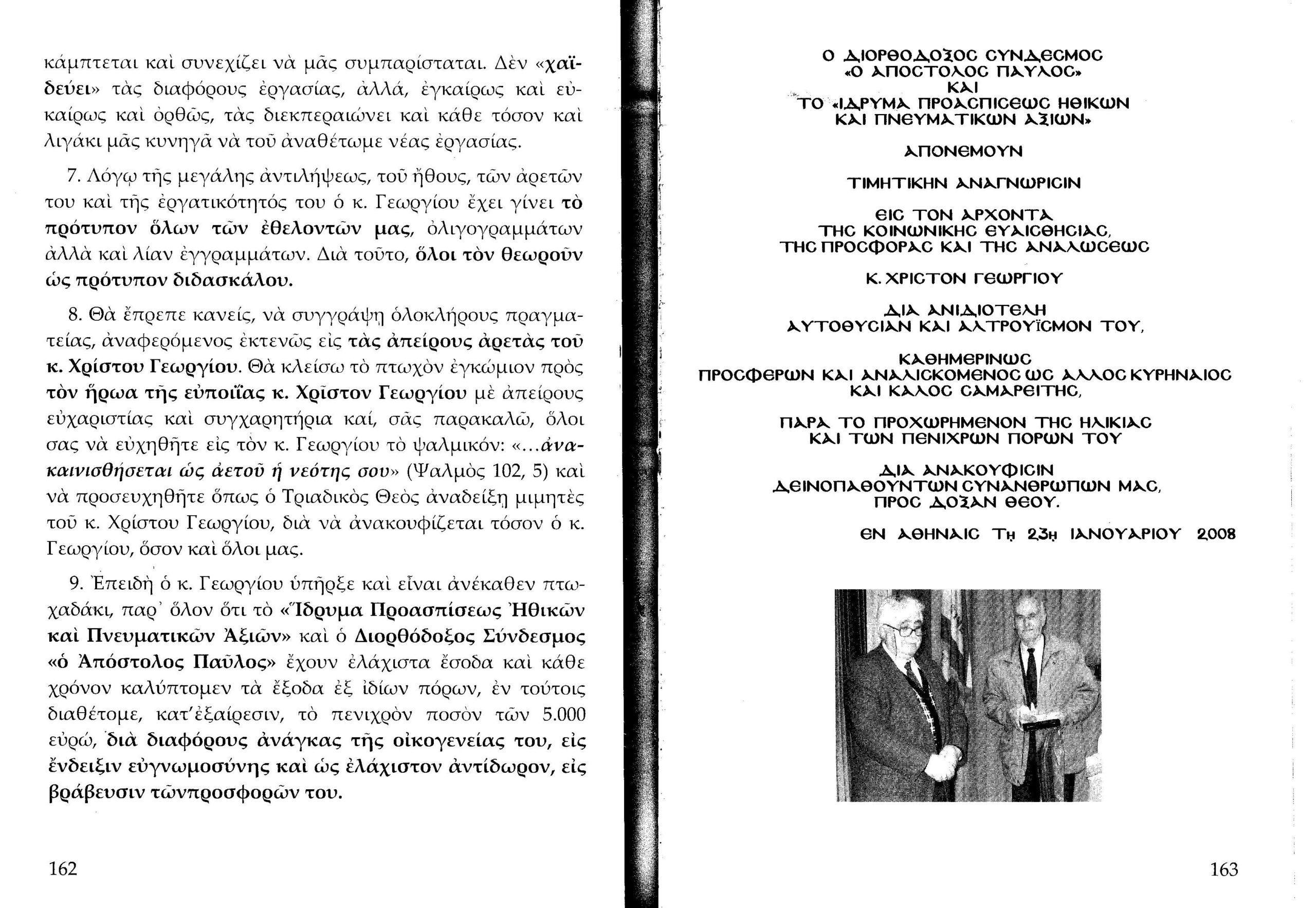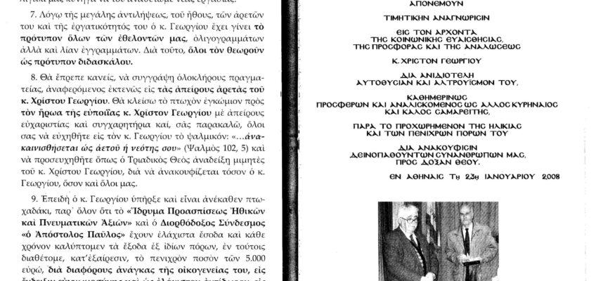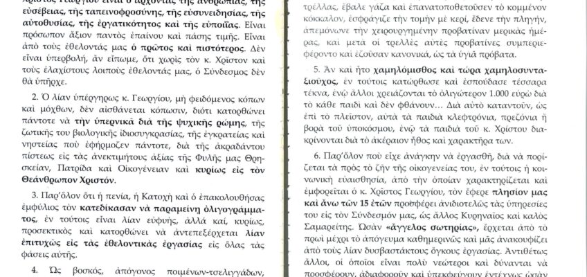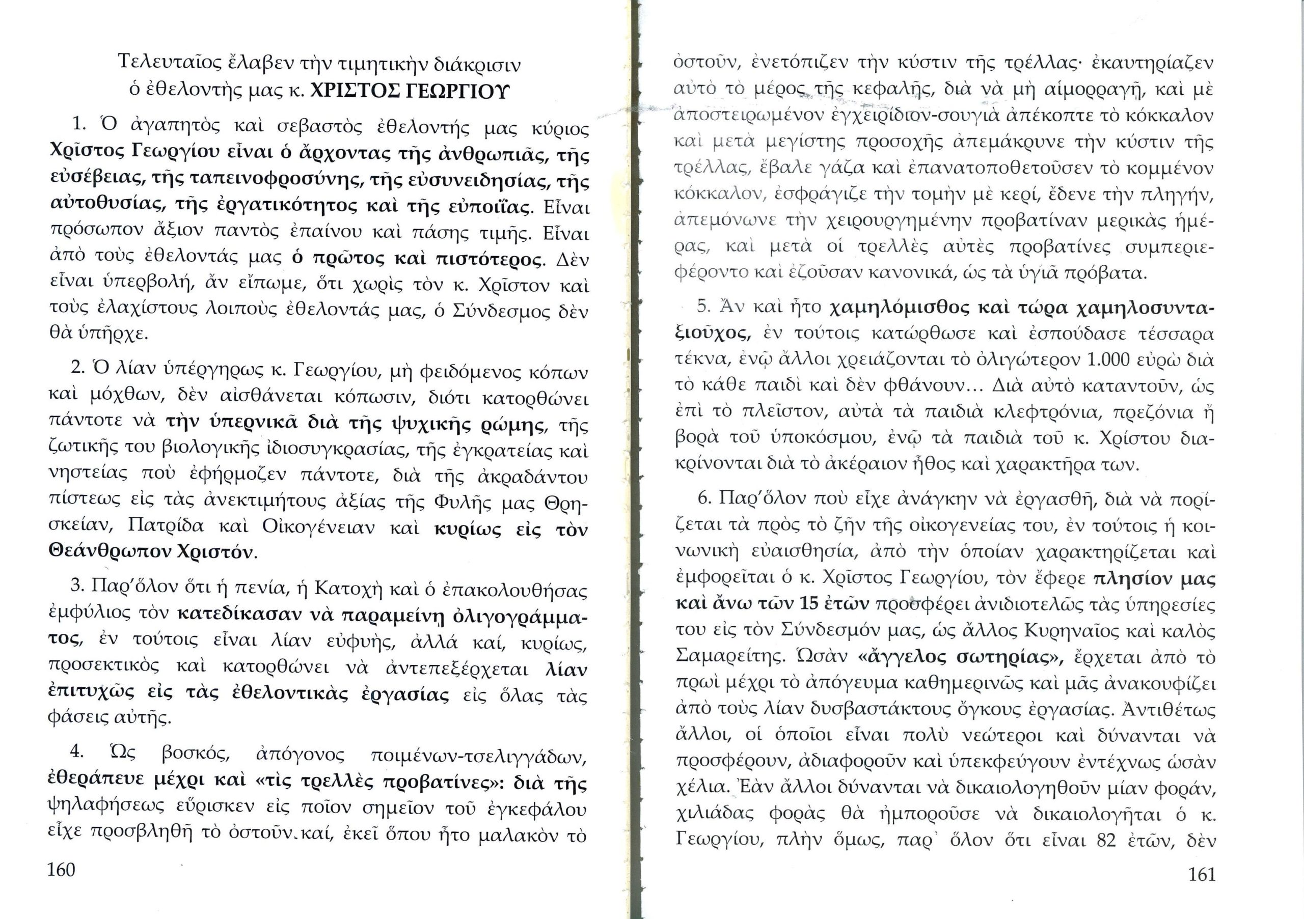 Ὁ ἀείμνηστος Χρῆστος Γεωργίου ἦταν πάντα πρόθυμος γιὰ ὅλες τὶς ἐργασίες καὶ ποτὲ δὲν καταδέχθηκε νὰ πάρῃ μία δραχμὴ ἤ ἕνα Εὐρὼ οὔτε γιὰ τὰ ἔξοδα του.